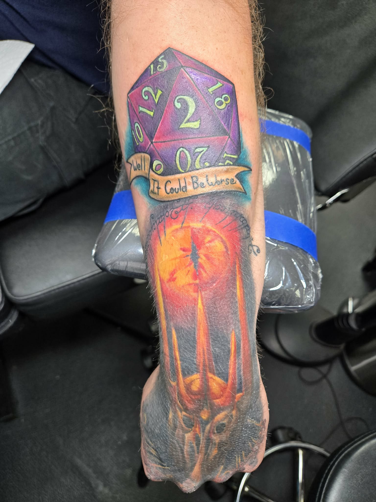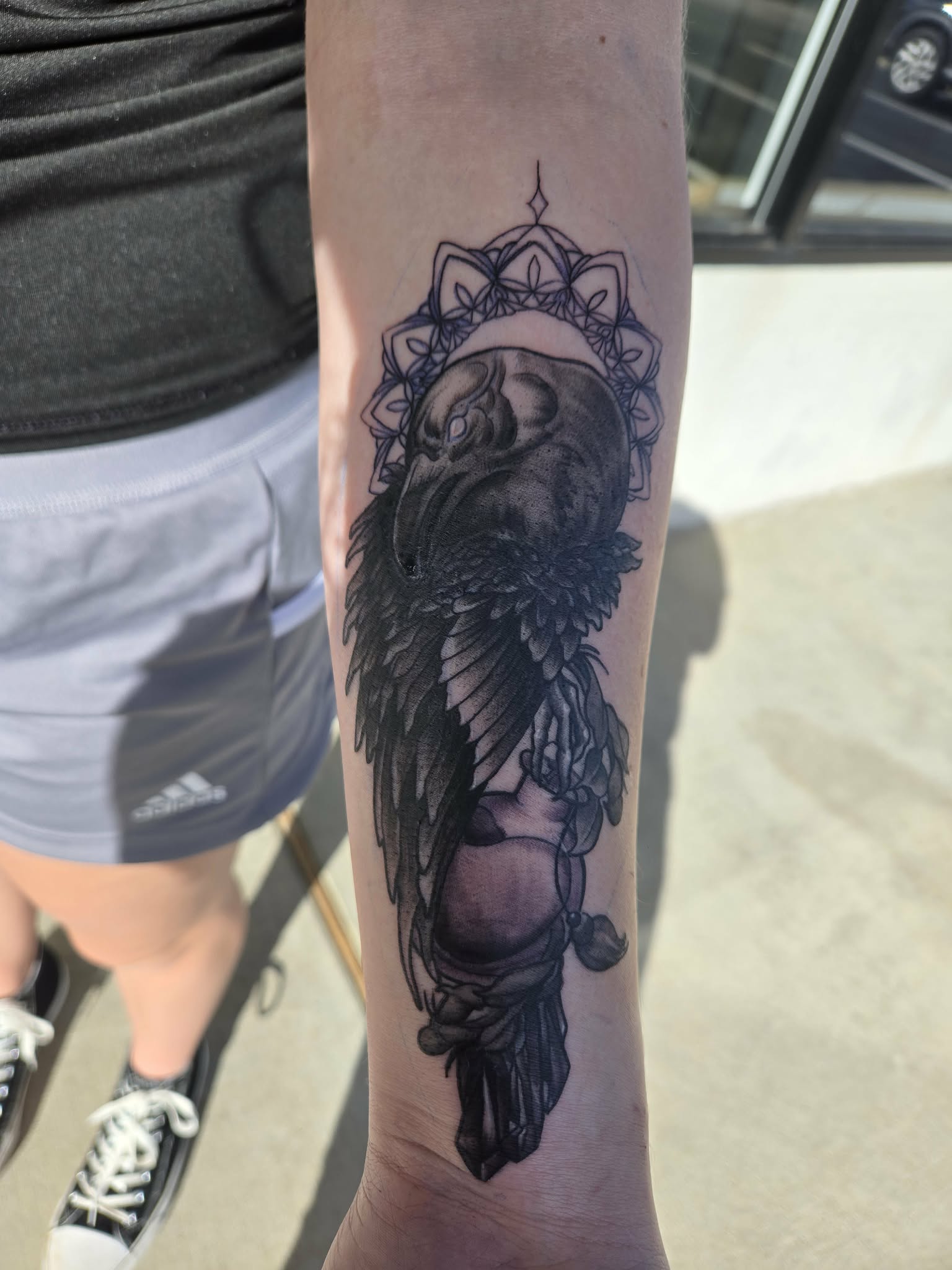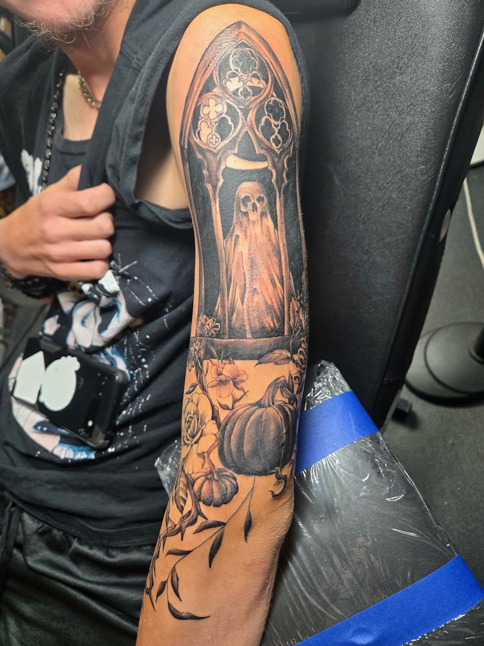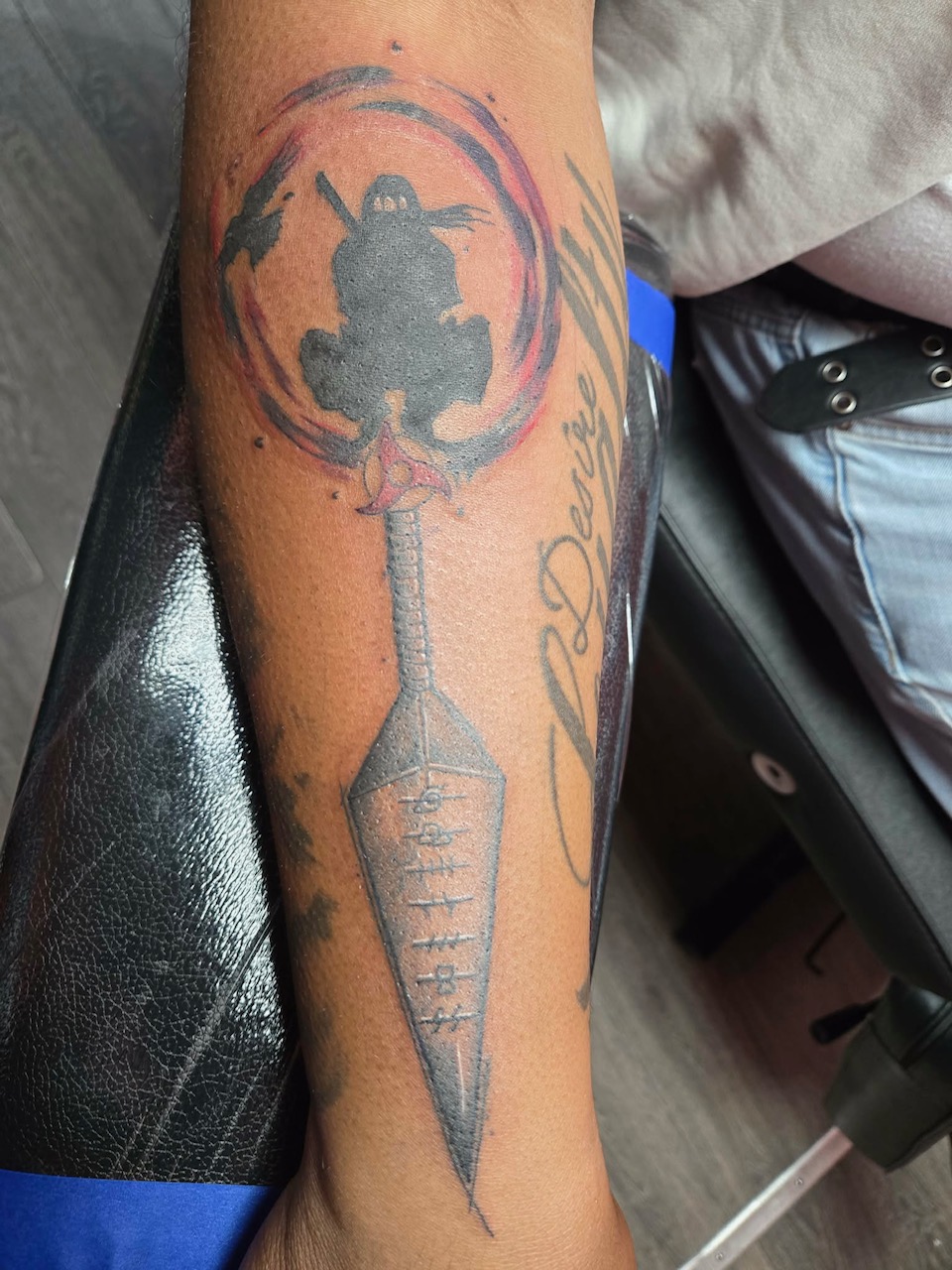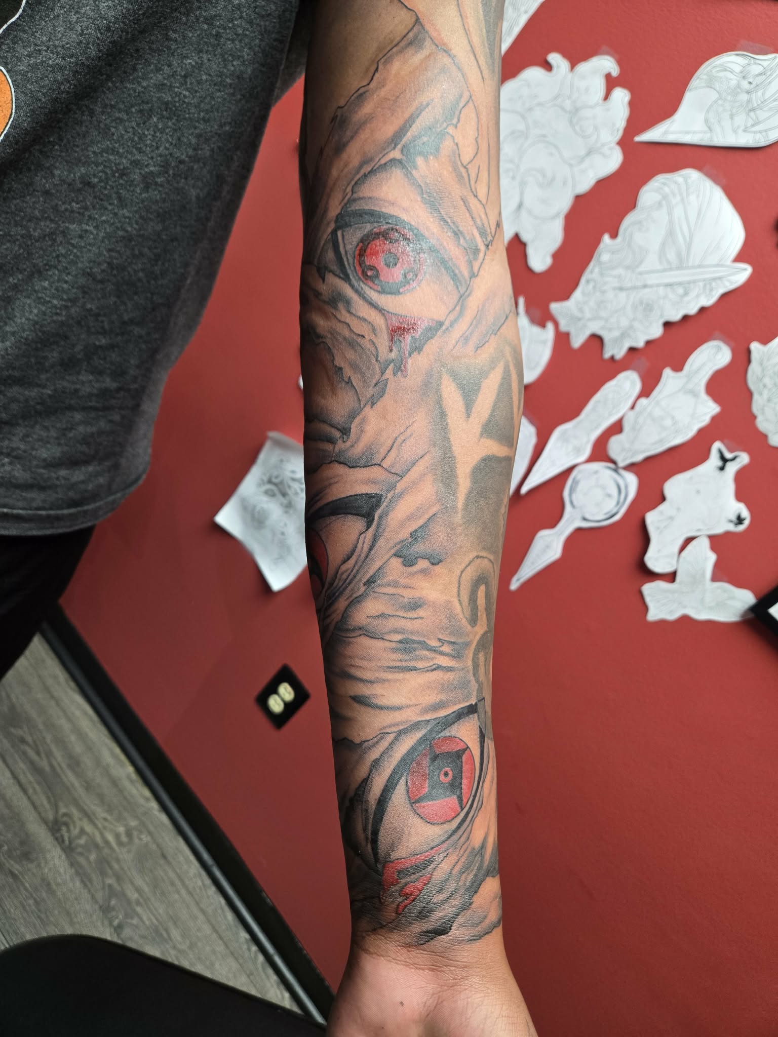 I specialize in custom works on a small and large scale. I also do cover-ups, black and grey, script and full color pieces. I pull inspiration from Dark Arts, Trash Polka and Anime style.