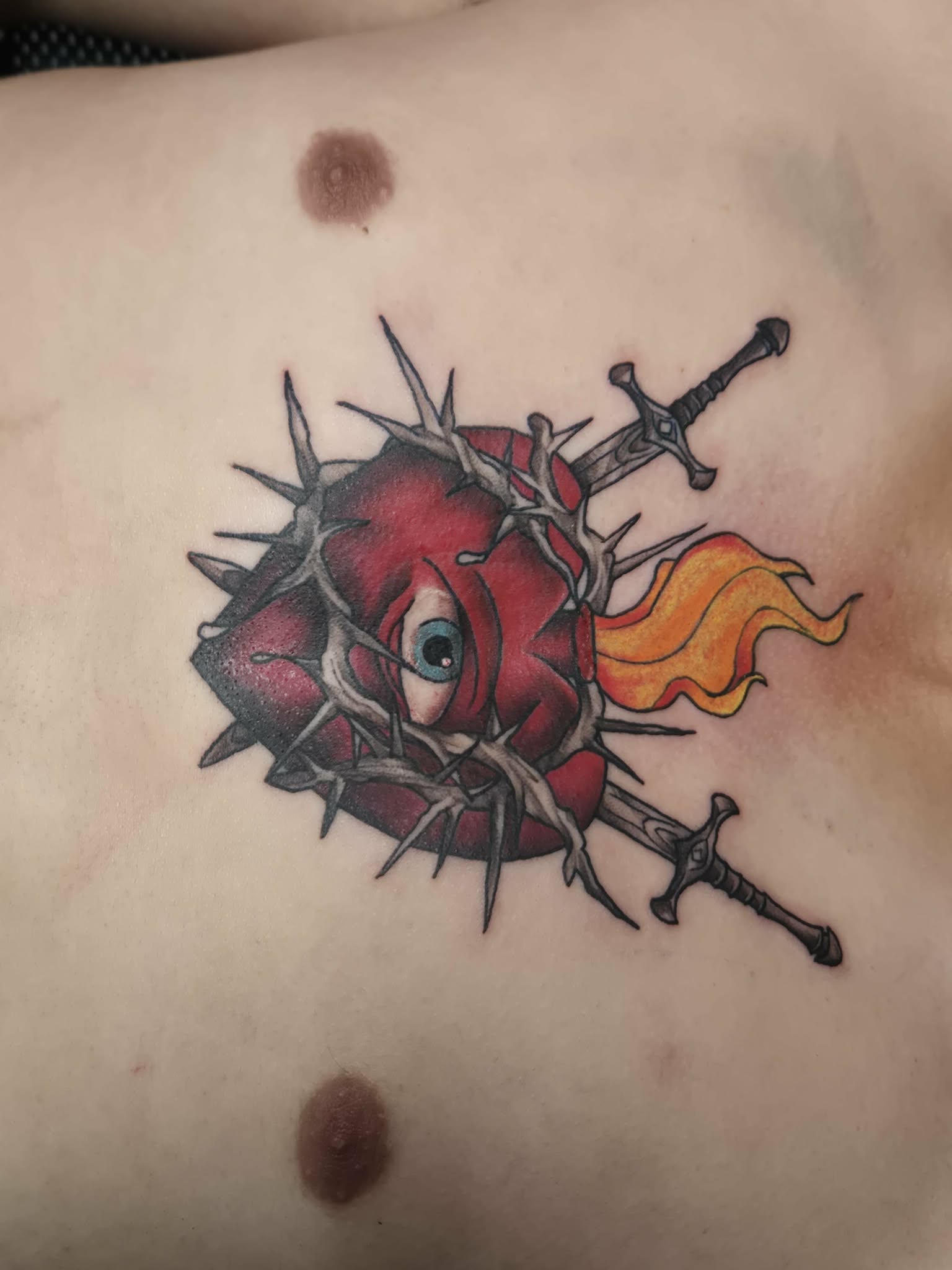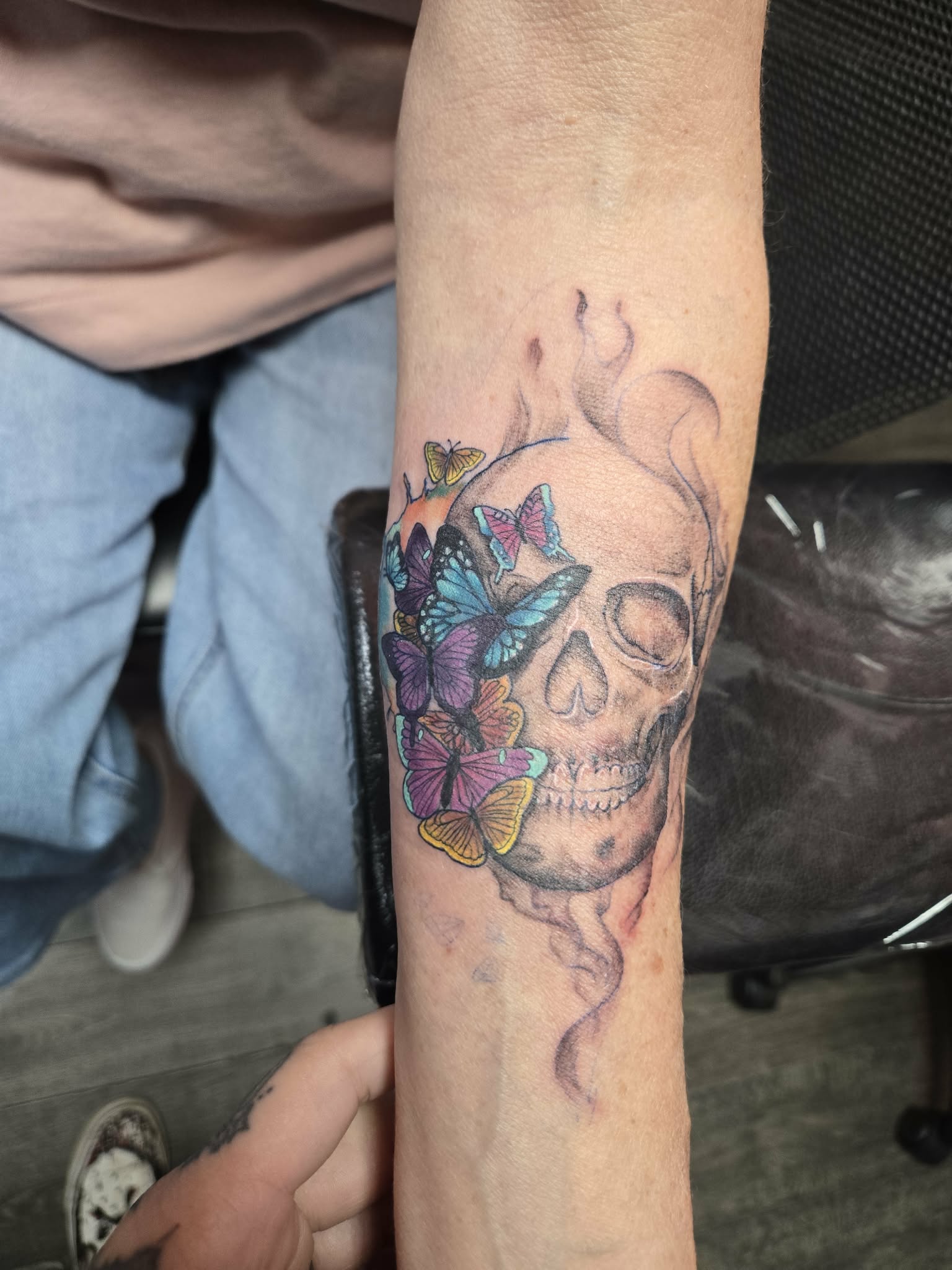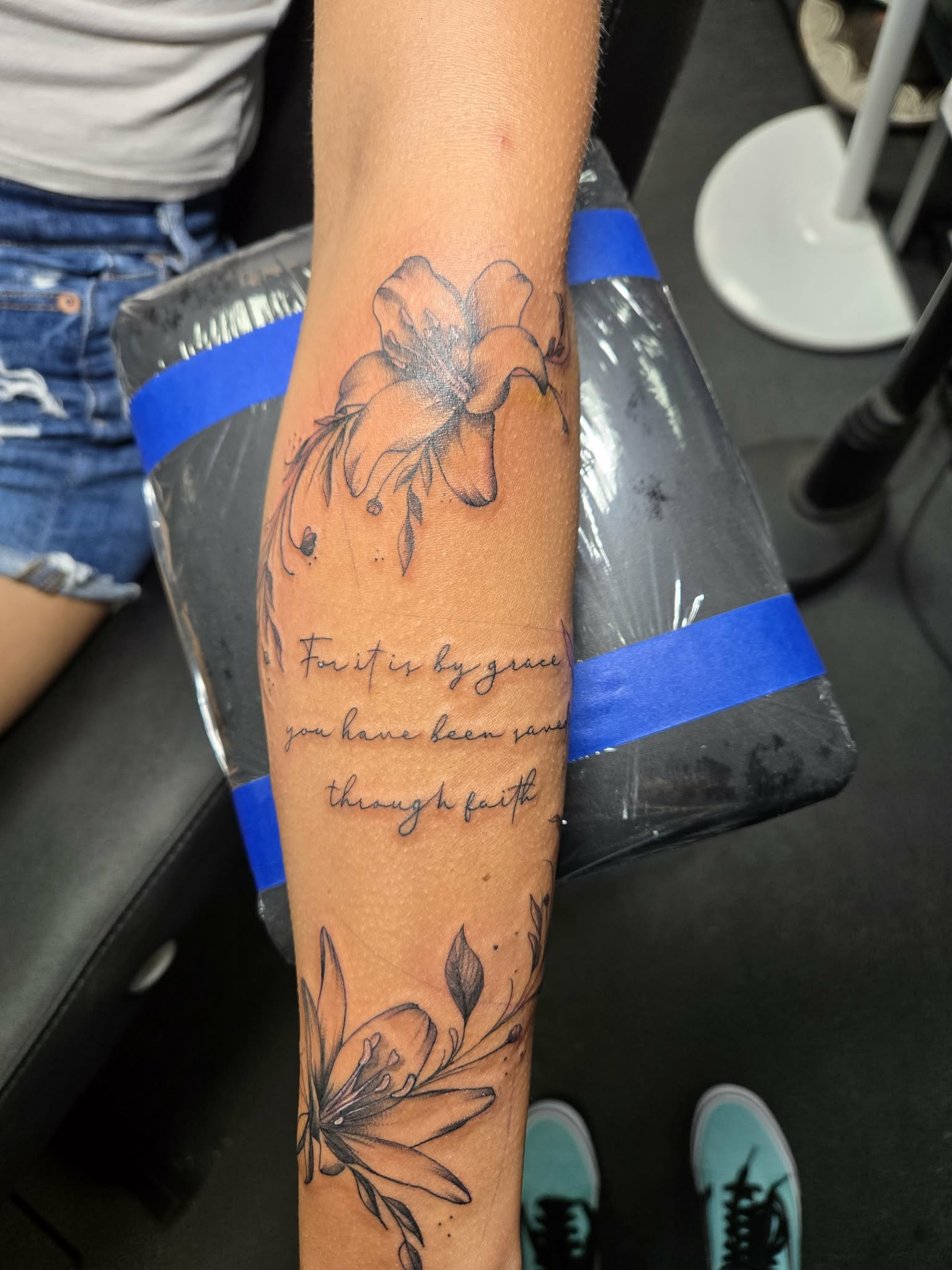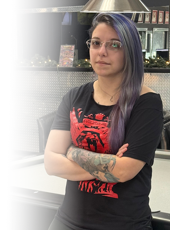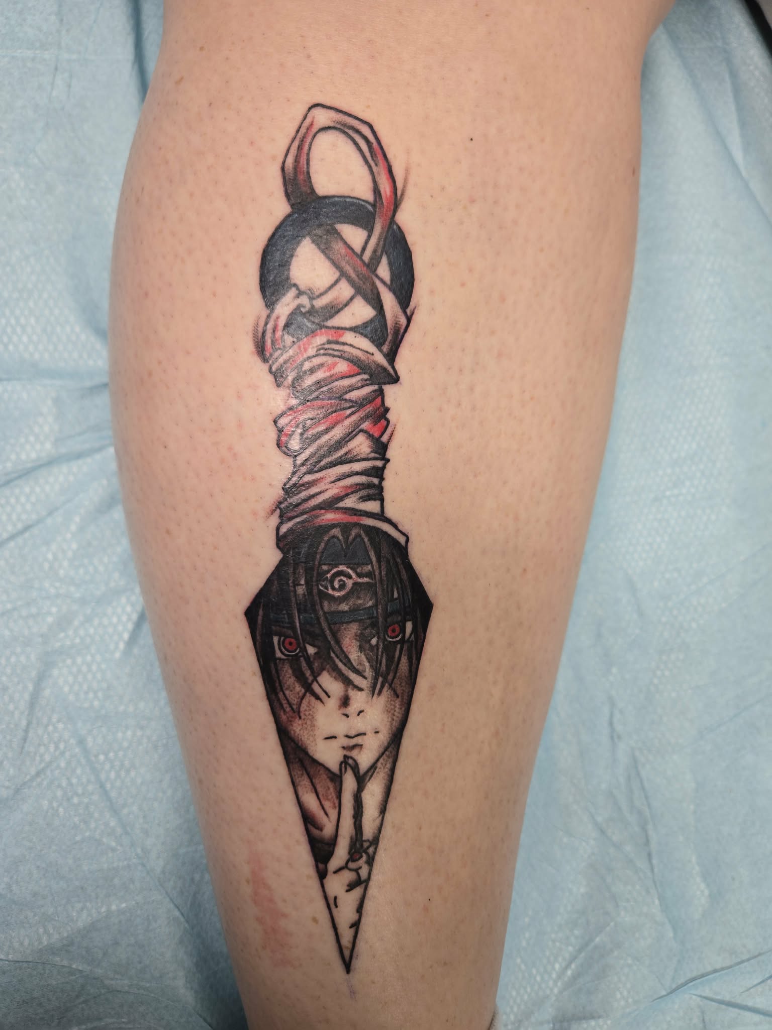 I specialize in custom works on a small and large scale. I also do cover-ups, black and grey, script and full color pieces. I pull inspiration from Dark Arts, Trash Polka and Anime style.