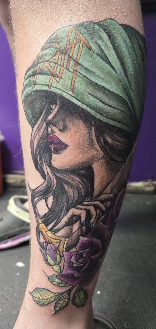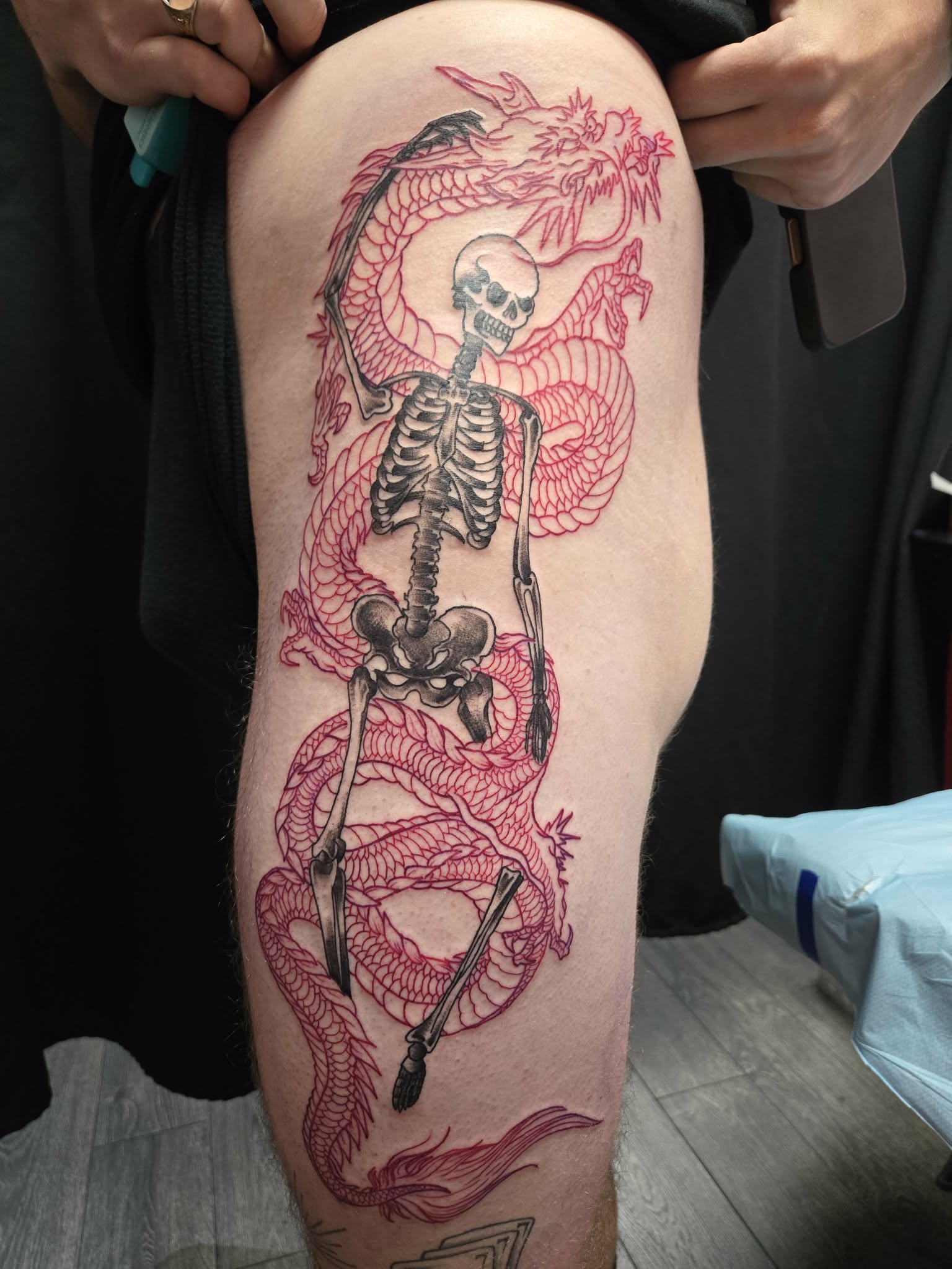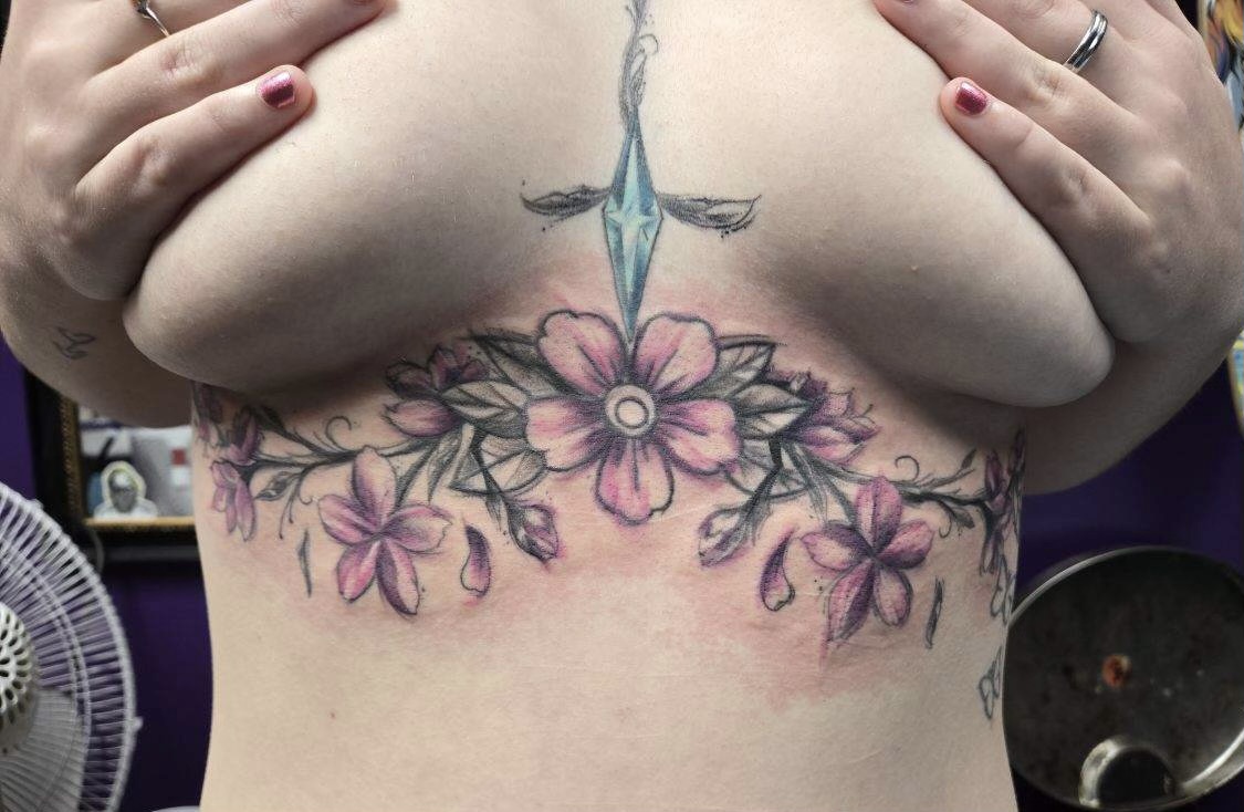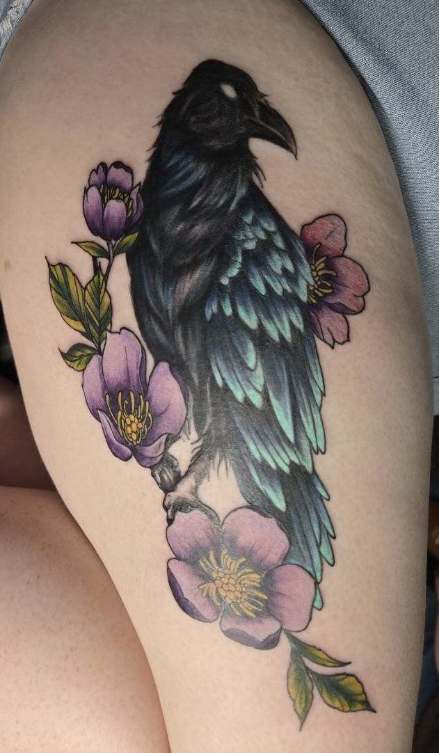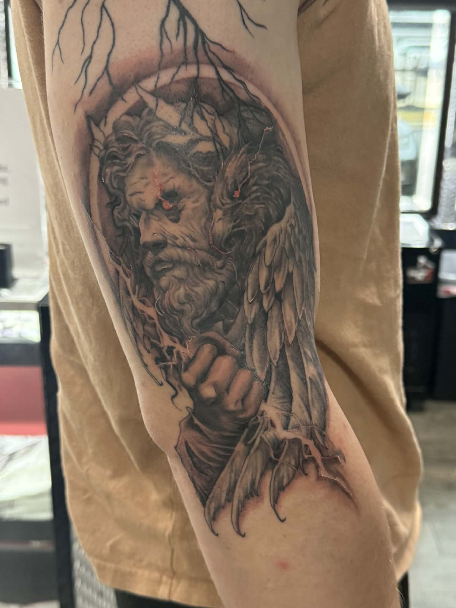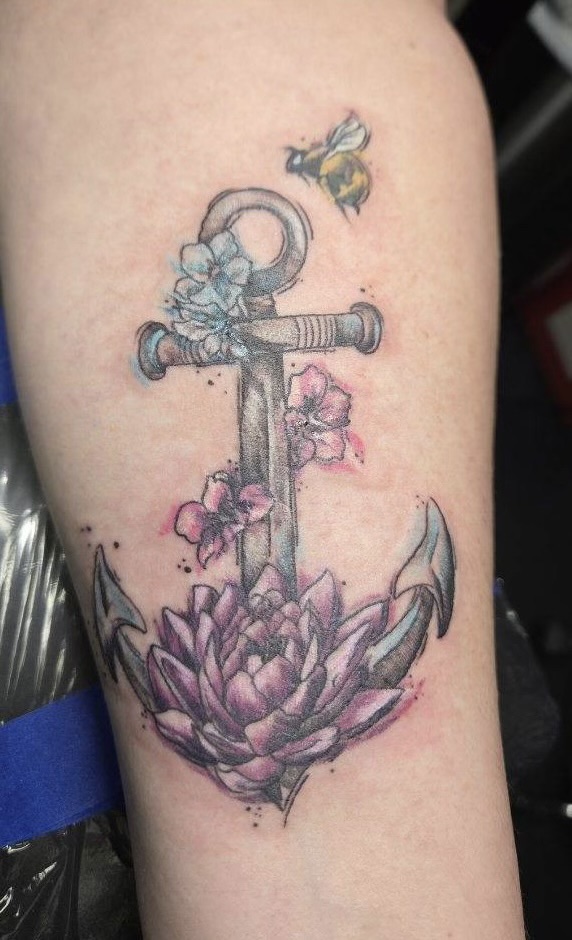 I specialize in custom works on a small and large scale. I also do cover-ups, black and grey, script and full color pieces. I pull inspiration from Dark Arts, Trash Polka and Anime style.