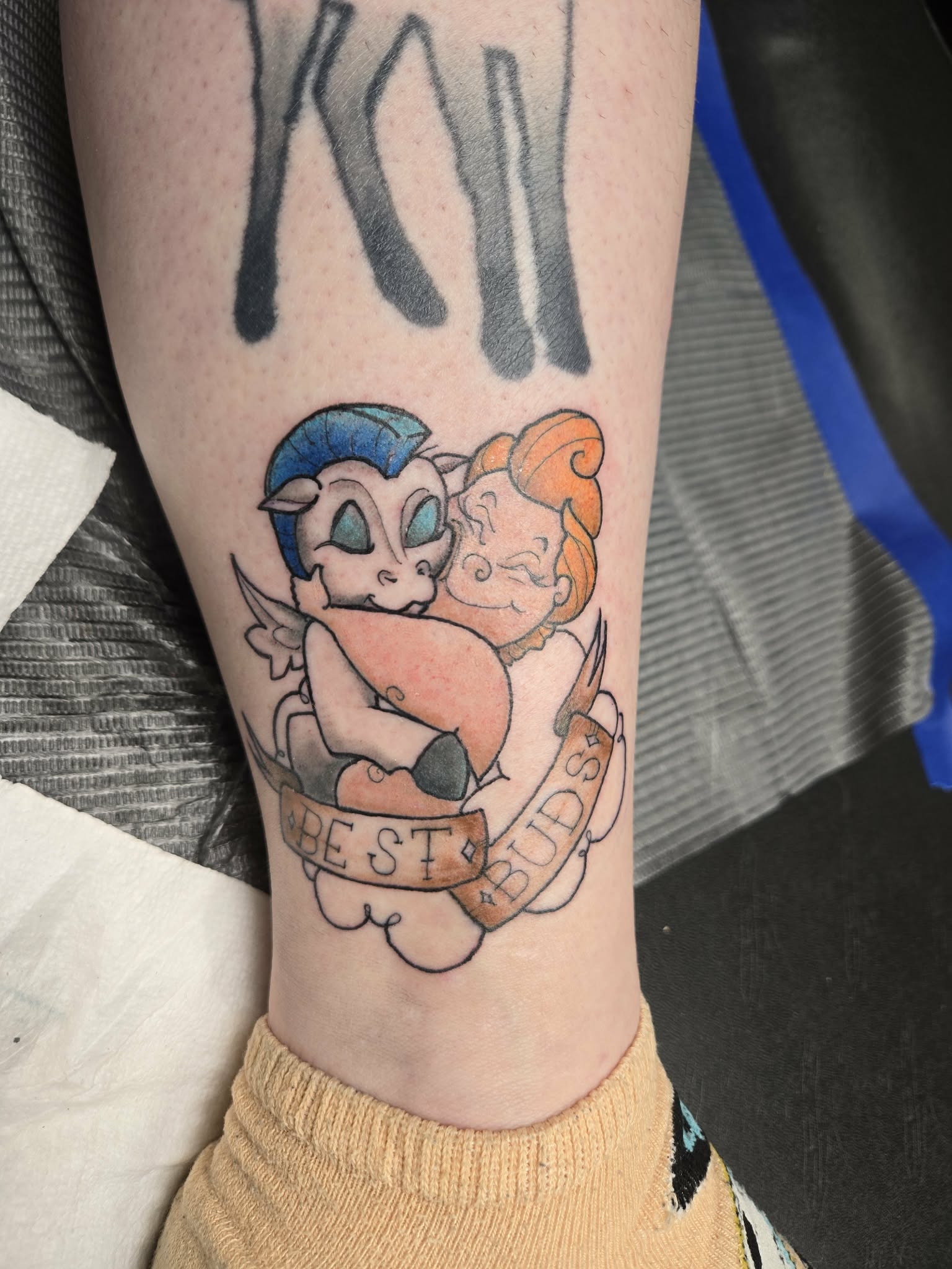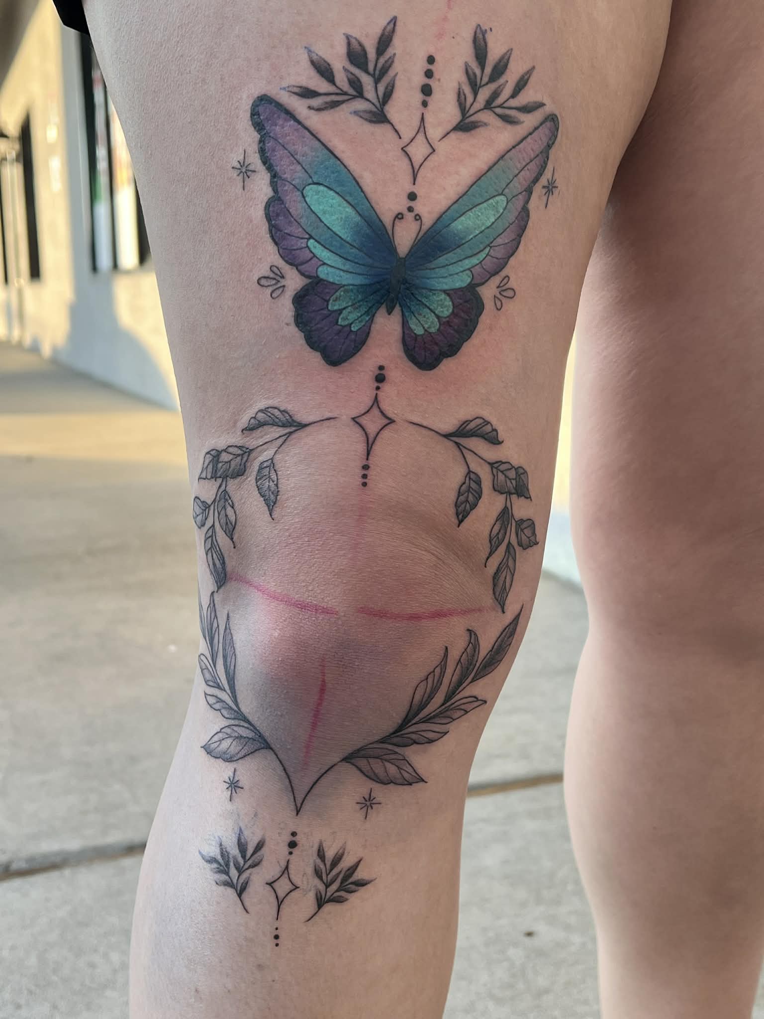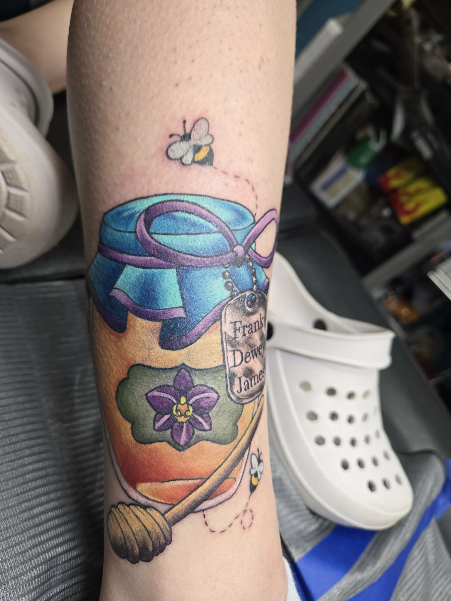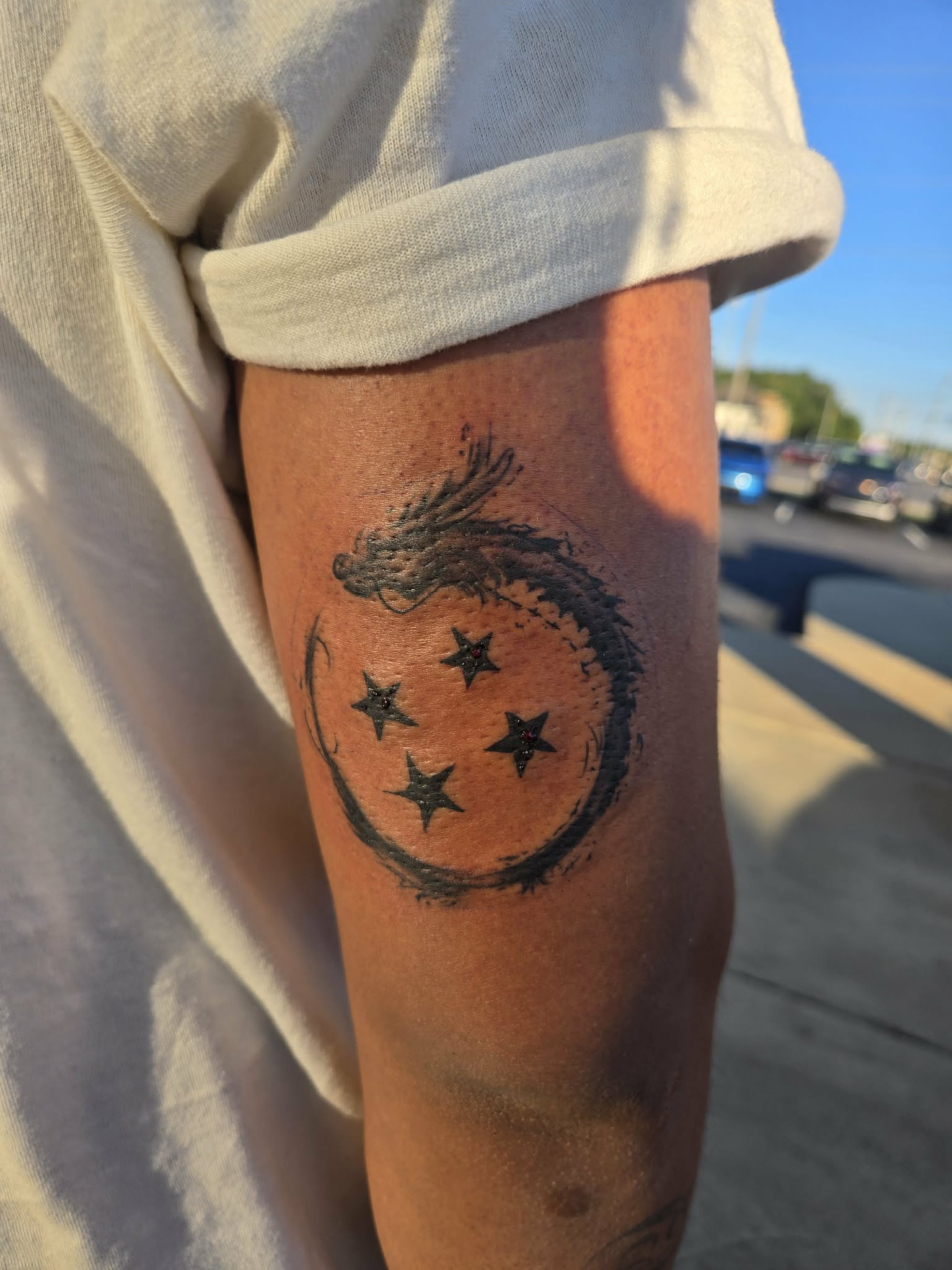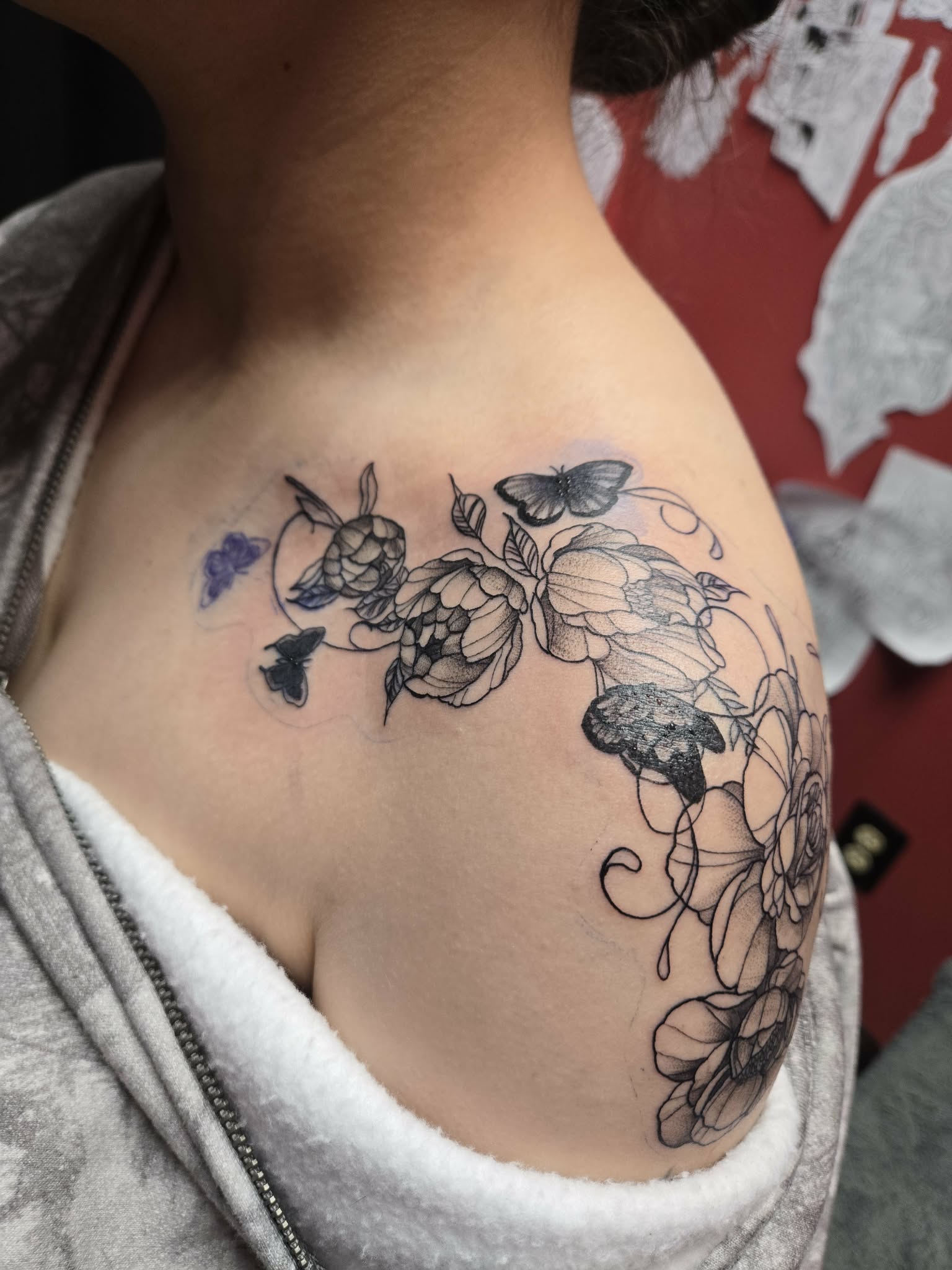 I specialize in custom works on a small and large scale. I also do cover-ups, black and grey, script and full color pieces. I pull inspiration from Dark Arts, Trash Polka and Anime style.
